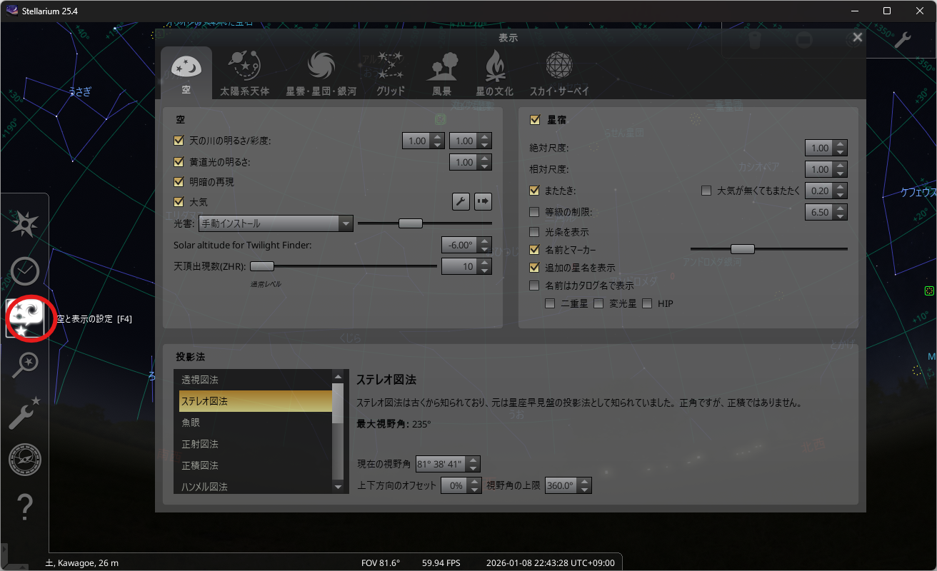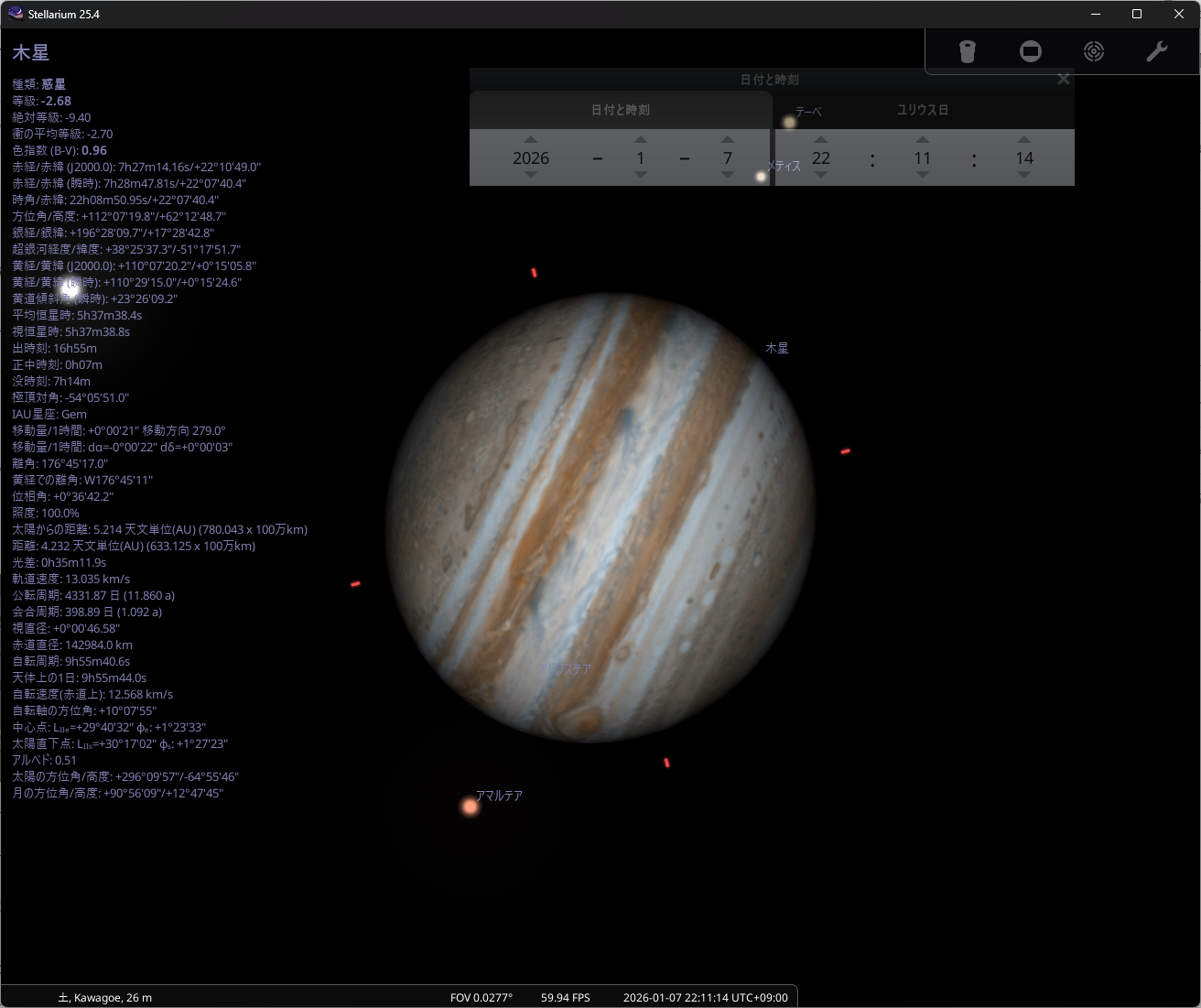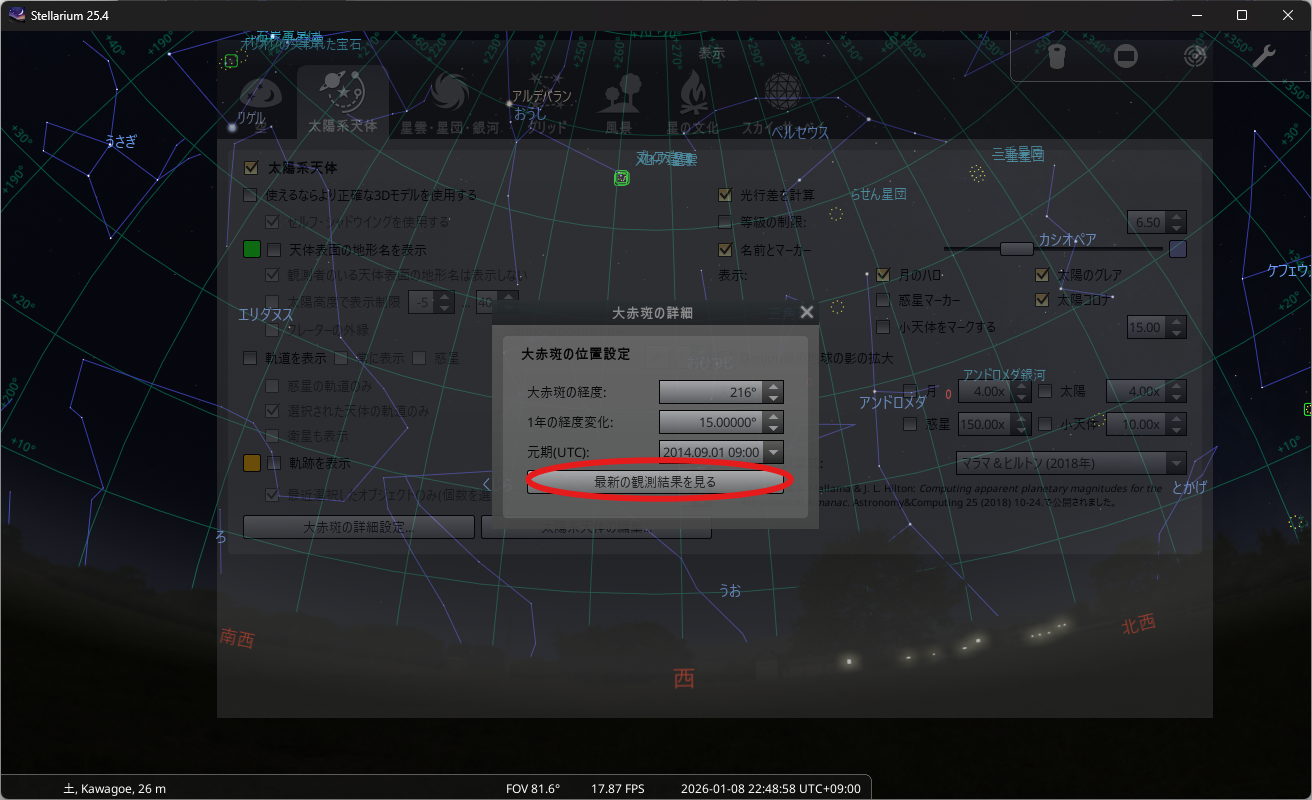 この結果から、Stellariumの設定画面にある「大赤斑の経度」と「元期(UTC)」の入力値は「87度」と「2026-01-08 00:00」となりました。