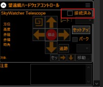 設定が完了すると望遠鏡ハードウェアコントロールの「接続済み」がチェックできるようになります。