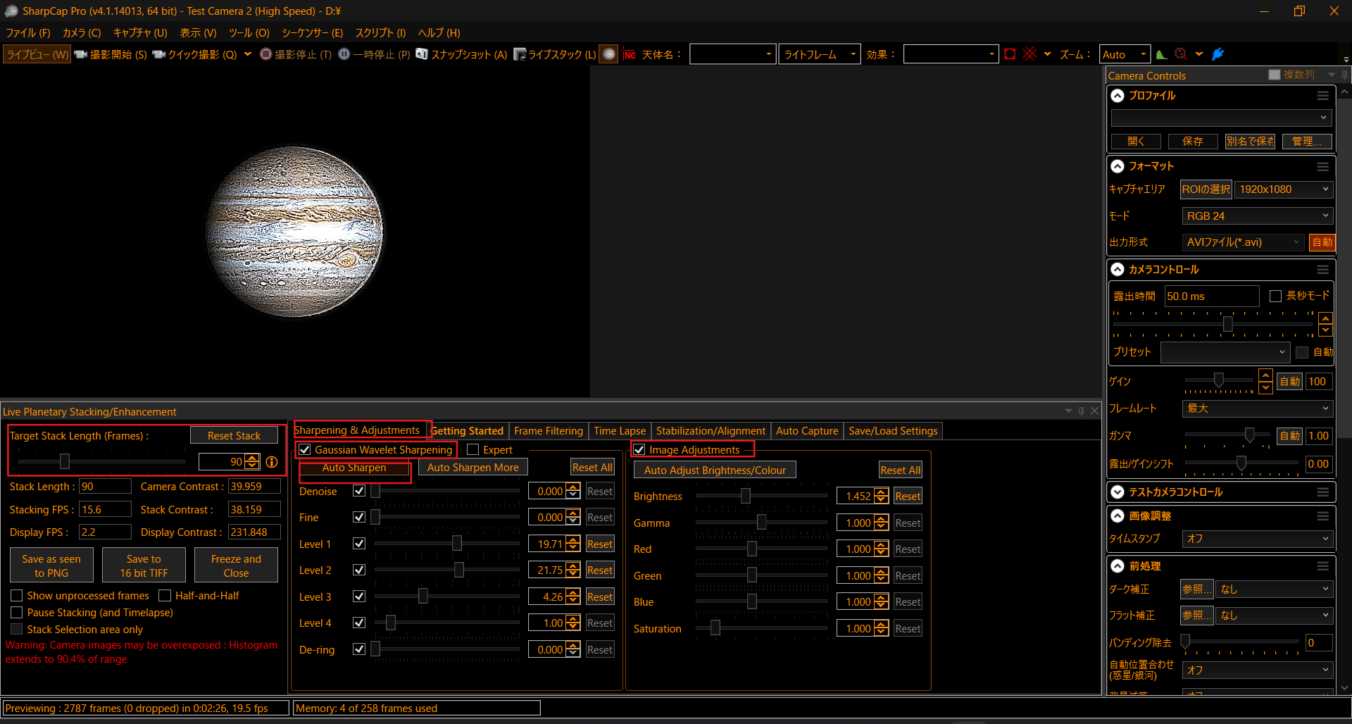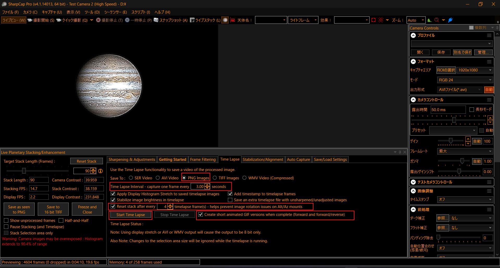 準備が整ったところで「太陽/月/惑星のライブスタッキングと強化」を開き、タイムラプスを作っていきましょう。